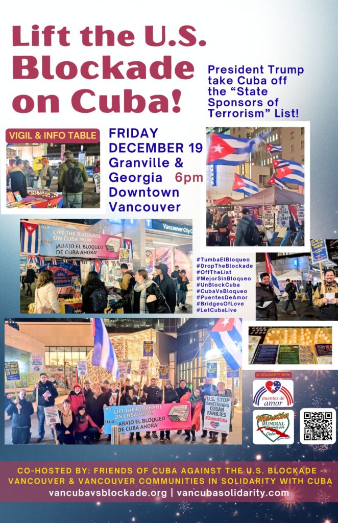 December 19, 2025: Vigil To End The U.S. Blockade on Cuba Friday December 19 6pm At Granville & Georgia Downtown Vancouver Co-hosted by: Friends Of Cuba Against the U.S. Blockade – Vancouver & Vancouver Communities in Solidarity with Cuba