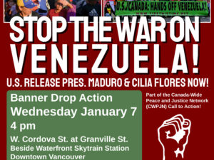 Banner Drop ActionStop the War on Venezuela! U.S. Release President Maduro and Cilia Flores Now! End Canada’s Complicity and Sanctions on Venezuela Now! Wednesday [...]