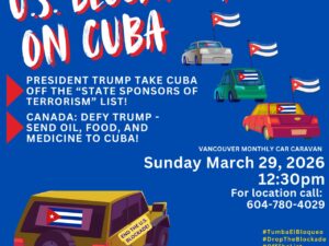 Sunday March 2912:30PM For location call: 604-780-4029 Organized by:Friends Of Cuba Against the U.S. Blockade – Vancouver In Solidarity with:Maratón Mundial de Amor por [...]
