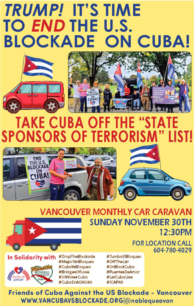 November 30, 2025: Join The Vancouver Monthly Car Caravan To Lift The U.S. Blockade on Cuba!